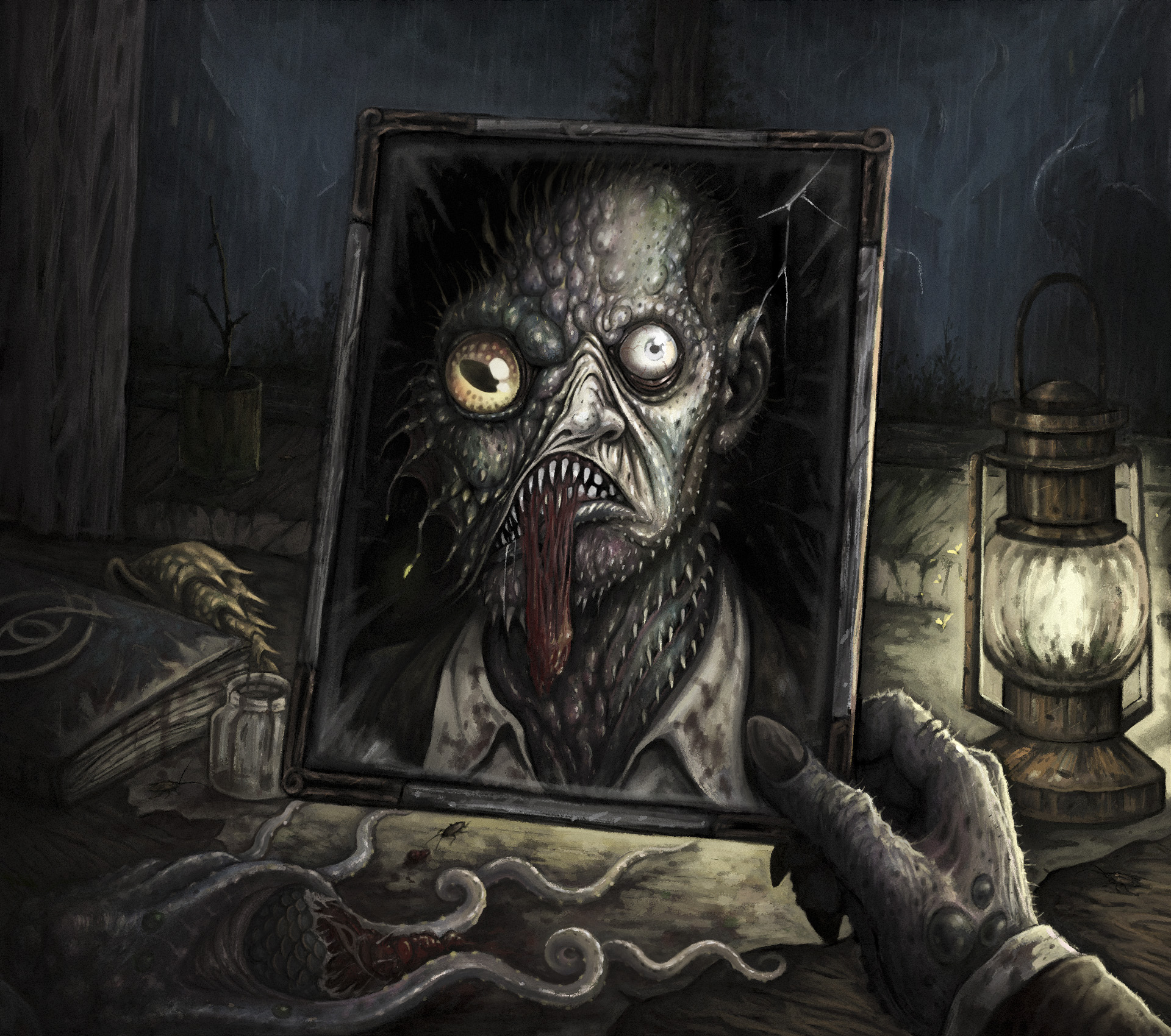 джедай интересная композиция не сам житель изображен, а зеркало, отражающее жителя, который тут проецируется на самого зрителя картины. замечательный переход. понравилась очень рамка зеркала - местами подржавевшая, местами запатиневшая, подгнившая, старая-старая, как сам житель. таракан на столе добил просто характерной деталью атмосферы запущенности и запустения. мелкие мотыльки у лампы теплый акцент, напоминающий все еще о жизни. а кто-нибудь посмотрел уже в окно? в окне дождь, другие обитатели и сам ктулху. атмосферно очень. ктулху фхтагн!