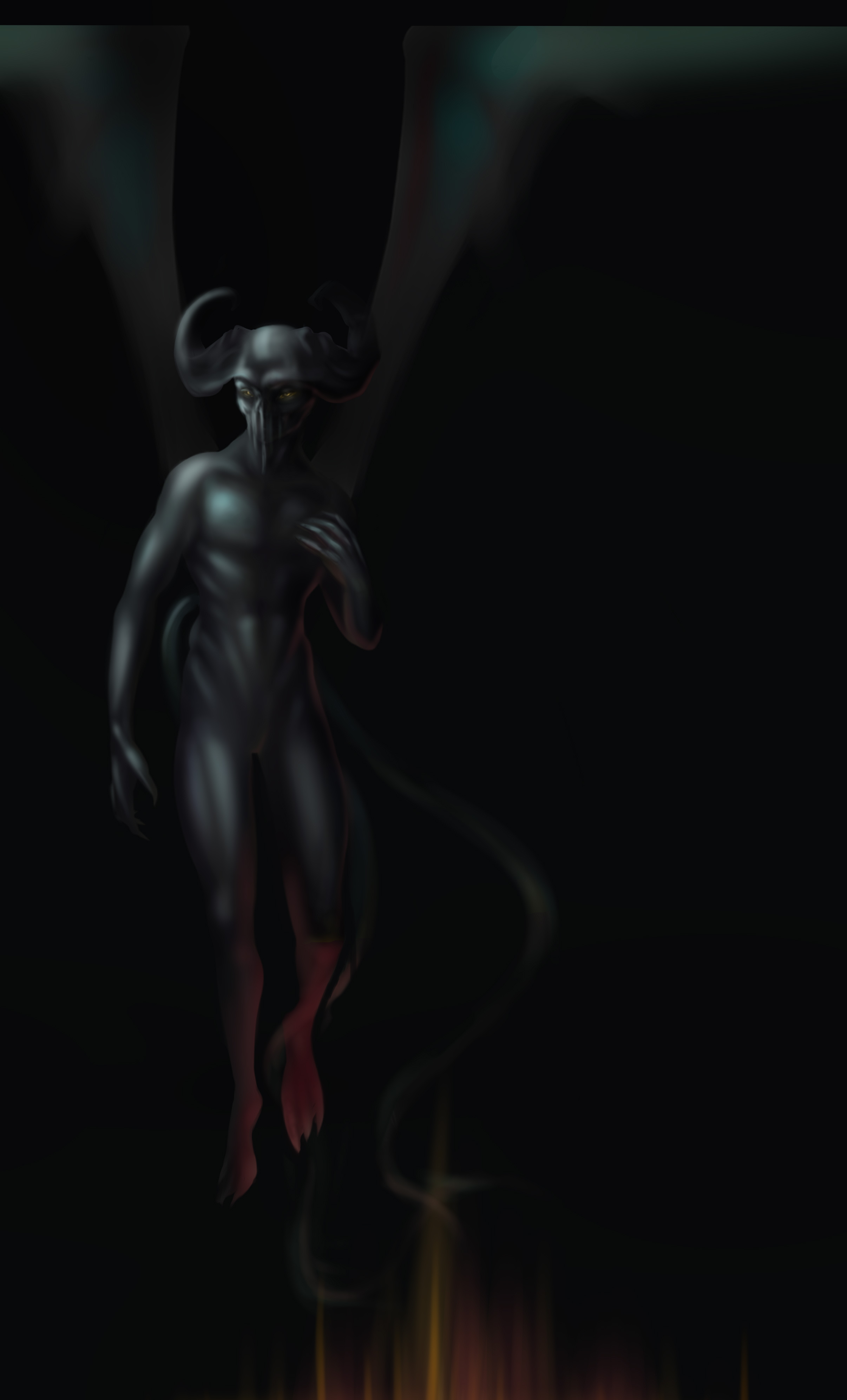 Chaёк - хорошая проработка тела и анатомии. теплые отсветы снизу, словно адская бездна встречает и ждет. картинка атмосферна. единственное чего лично мне не хватило - точности некоторых деталей, колючести хвоста (он кажется немного эээ гладким везде, как само тело твари) и перепонок на крыльях, по цитате( крылья на рисунке лишь фоново даны. и лицо ясно выражено, щупальца и четко прорезанные глазницы и глаза в них. может, лучше бы было к самому рисунку взять просто другую цитату оттуда же, применимую к данному существу? потому что существо абсолютно лавкравтовское. зато с такими крыльями веришь в беззвучность хлопания и и ужас самого бедняги картера, голографические переливы цвета выглядят инфернально.